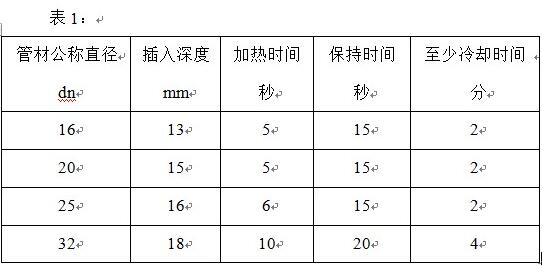 4)從現(xiàn)在開始即進(jìn)入加熱時(shí)間,并加熱至表1中規(guī)定的時(shí)間。規(guī)定的加熱時(shí)間到達(dá)后,從加熱模頭上拔出管材和管件,拔出速度應(yīng)適中,不能過急,但可以略帶輕微的抖動動作,以利于拔出。