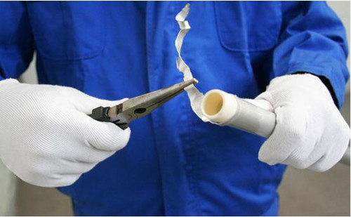 步驟四:去掉鋁合金層:采用鉗子等輔助工具將管材端頭切開的鋁合金層去掉。