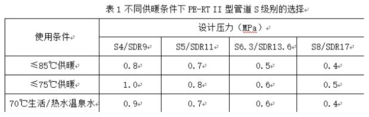 由以上表可以看出,PE-RT II型管道一般選用S5系列即可滿足小區(qū)集中供暖管網(wǎng)的運行溫度、1、壓力要求